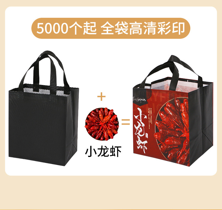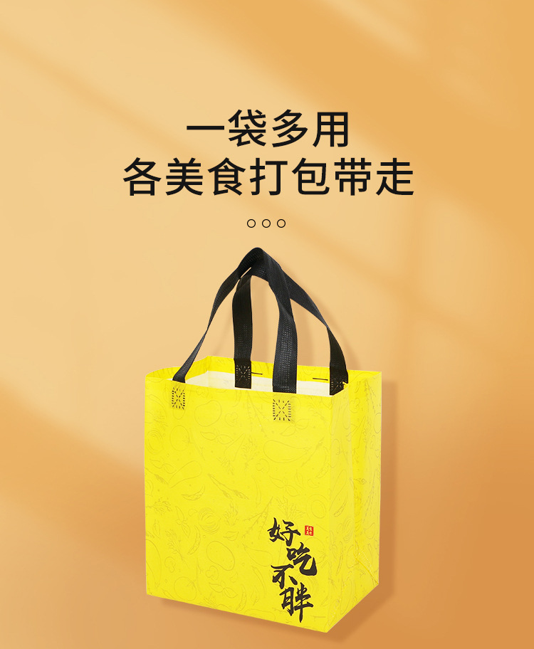 廣告宣傳:無紡布覆膜外賣袋可以作為商家的廣告宣傳工具,客戶可以在袋子上印上自己的品牌LOGO或宣傳語,增加品牌曝光率。